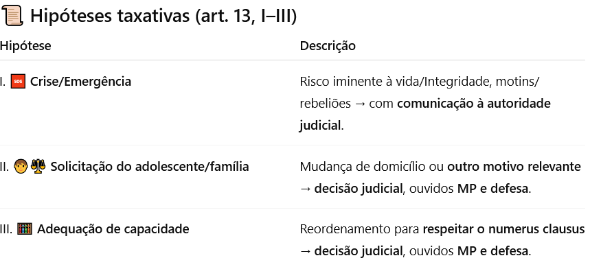 🎯 Critérios para solicitação/análise (art. 7º, §1º): disponibilidade, proximidade familiar, local do ato infracional, idade, gravidade e reiteração.